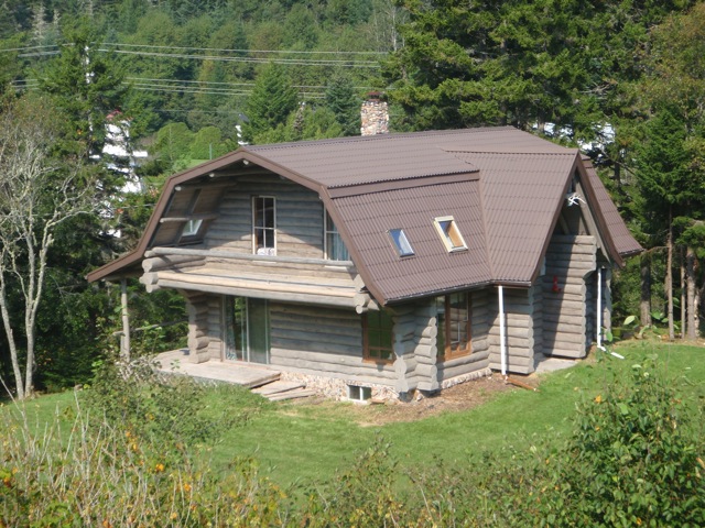 A well-designed log home has a good foundation with no less than 12” clearance between the logs and the ground. The roof overhang should be at least 3′ at the eaves and 4′ on the gable end walls. With higher walls, or in exposed locations, wider overhangs are required to protect these walls. Eaves trough and downspouts will carry the water away from the building. This is especially important in areas subject to high winds and horizontal rains. Any log posts should have a moisture barrier between the wood and concrete support. The trick is to keep water moving away from the building from the time it lands on the roof until it drains from the site. This includes proper flashing at chimneys, windows, doors, gable end framing and between the sill logs and the foundation. The logs themselves should not have any flat areas where water can lay or flow into the building.